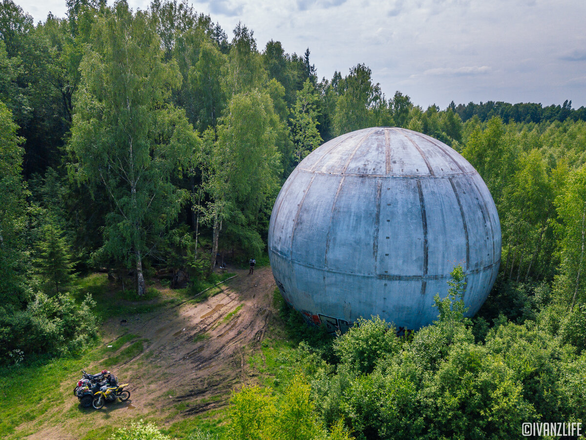 - Неподалёку от Дубны среди леса высится необычный объект– серебристый шар высотой с пятиэтажный дом. Конструкция диаметром около 18 метров пользуется известностью у туристов, но откуда она появилась в этих глухих местах, однозначного ответа нет.