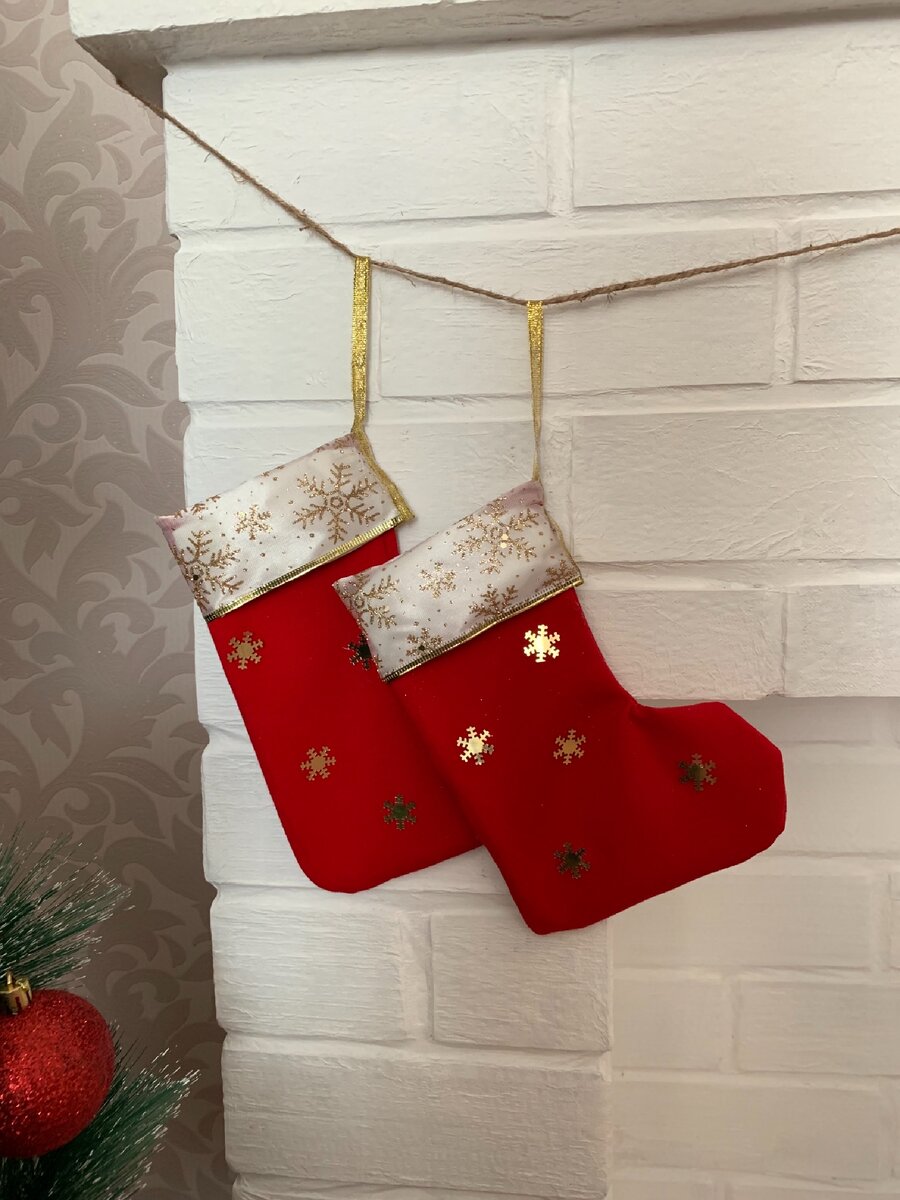 В этой статье хочу рассказать как я сшила новогодние носочки, которыми украсила наш камин, сделанный своими руками. О том, как мы его делали, можете посмотреть здесь: https://zen.yandex.ru/media/id/5dde7891e72c9417cb72ce58/kamin-svoimi-rukami-5dde811e21552277da47bc0c Изначально долго не могла найти подходящего шаблона, поэтому набросала эскиз сама. Размер 18х14 см. Для основы взяла красную трикотажную ткань, а для верхней части носочков была куплена декоративная лента со снежинками в Фикс прайс. Так же для украшения я купила золотые снежинки в Леруа Мерлен. Обвела шаблон и вырезала выкройку. Шила я из юбки, которую больше не собиралась носить, поэтому края у меня уже прошиты. Затем подшила к верхнему краю декоративную ленту и прошила по периметру, отступая примерно 0,5 мм от края. Развернула носочек лицевой стороной и приклеила снежинки на клей пистолет. После того как был готов и второй носок нужно было сшить на них петельки, чтобы их можно было подвесить. Для этого взяла тонкую зо