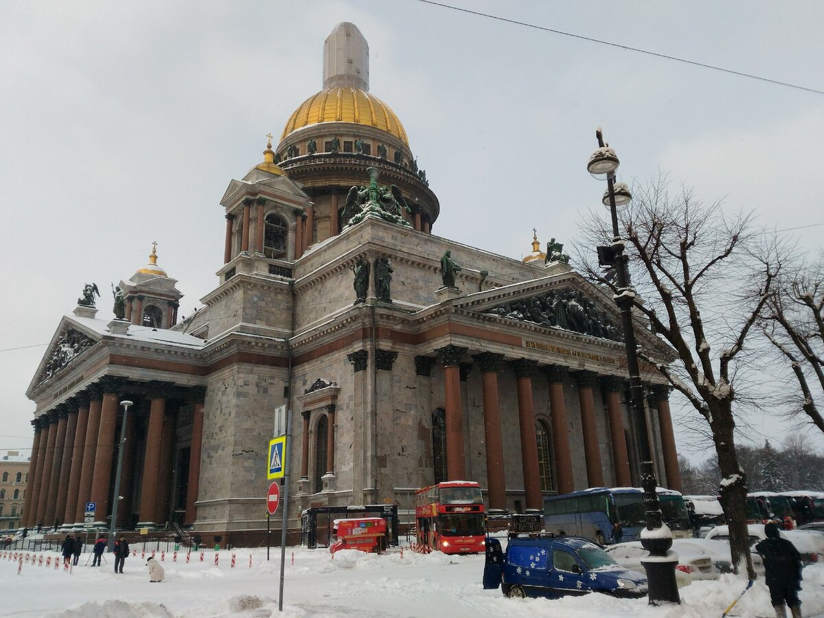 Исаакиевский собор выглядит мрачно, у него серые стены, он украшен тёмными скульптурами. Не то что Храм Спаса на Крови. У Исаакия (собор часто так называют) нет ни эмали ни изразцов, ни росписи. Что может быть уникального в таком соборе? Внешность обманчива, внутри собора очень красиво. Как так? Серые стены и при этом золотые скульптуры внутри? Во время посещения собора можно дар речи потерять! Люстры многоярусные, как будто сотни свечей освещают собор. В этом месте до 80-х годов прошлого века находился Маятник Фуко, хорошо что его сняли. Скорее всего он не позволял любоваться красотой Храма. Собор превратился в музей, но сохранился алтарь. Храм на половину действующий, на половину нет. Можно купить свечи, иконы, крестики и многое другое. Зелёные колонны прекрасно сочетаются с золотыми элементами. Страшно подумать сколько времени заняла роспись потолка и стен! Собор словно разделён на несколько залов, у них разное оформление. Обратите внимание на изображение животных: лев,