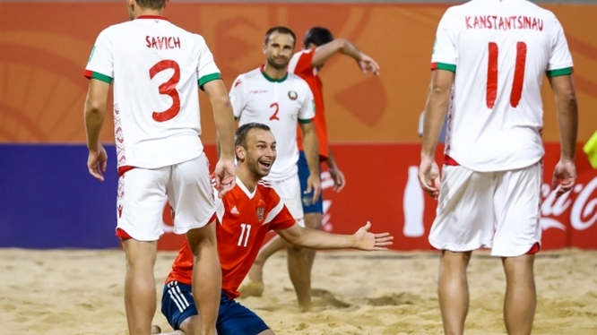Сборная России по пляжному футболу обыграла команду Белоруссии со счетом 5:3 в третьем туре группового этапа чемпионата мира. Турнир проходит в Парагвае. В составе российской команды мячи забили Борис Никоноров (6-я, 16-я и 34-я минуты), Федор Земсков (14) и Дмитрий Шишин (36). У проигравших отличились Олег Гапон (5), Игорь Бриштель (7) и Иван Константинов (10). Сборная России заняла второе место в турнирной таблице группы С и обеспечила себе участие в четвертьфинале, набрав шесть очков в трех матчах. Первое место в группе заняла сборная Сенегала, на счету которой тоже шесть баллов, однако африканская команда имеет лучшую разницу забитых и пропущенных мячей.