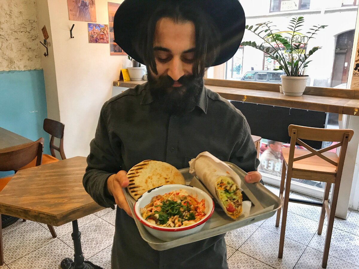 В меню ассортимент семитских блюд: фалафель, хумус, швармы, роллы, запеченные овощи, соленья, супы, а из напитков израильское пиво, лимонад, бубалех. Лепешки, лаваши и питы пекут на месте. Цены приятные, но и на гурме не рассчитывайте. В отличие от восточных стран, спелые и ароматные овощи в наших краях стоят дорого, несмотря даже на то, что рядом Апрашка. Ситуацию спасает внушительный набор восточных специй. (Это был намек на то, что овощи прям ну пластмассовые).
