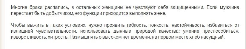 Не мы такие, жизнь такая... Попалась статья, где автор объясняла женскую жестокость ответом на суровые условия жизни, мужское насилие, слабость и инфантильность. Но достаточно пойти в ближайшую школу или почитать сводки криминальных новостей и становиться ясно, что главными зачинщиками буллинга, являются девочки. Большинство из них, родились в обеспеченных семьях. Такие девочки ни в чем не нуждаются, ни в чем себе не отказывают. Они не были жертвами жестокости, но зная свою полную безнаказанность, сами стали агрессорами. Они снимают свои действия на камеру, смеются...Таким поведением малышки не защищаются, а получают удовольствие, унижая других. Если верить результатам выдачи гугла, в подавляющем большинстве, мужчины добрее и ответственнее женщин. В прошлые века, жизнь многих женщин была кошмаром. Они выходили замуж за нелюбимых мужчин, тянули на себе огромное хозяйство...но тем не менее передавали детям любовь к жизни, человечность, доброту. А графини, помещицы, пани и прочие дамы вы