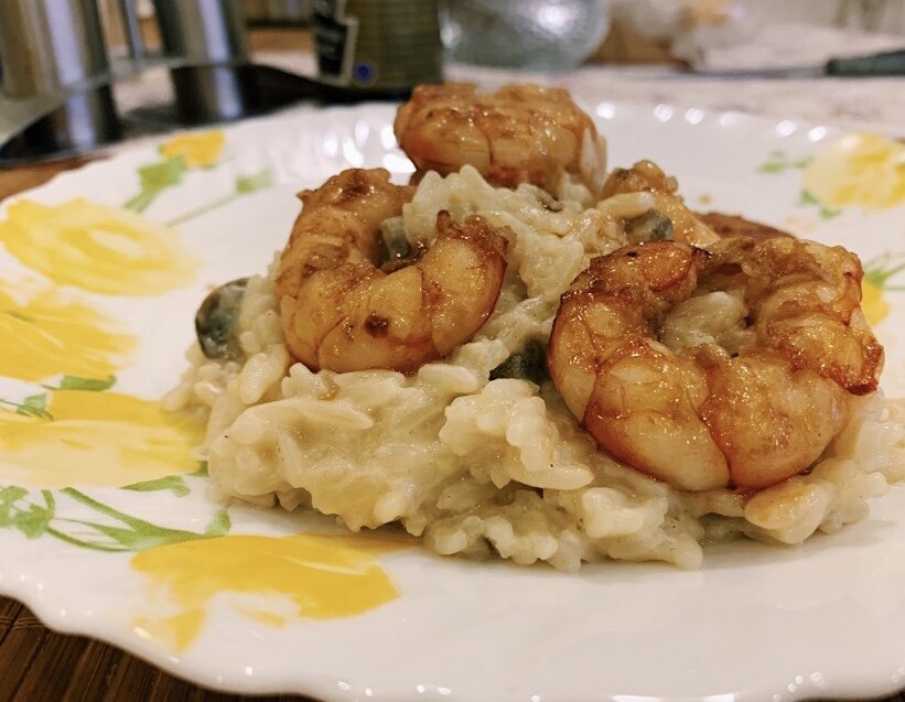 Делюсь рецептом ризотто с лангустинами. Нам понадобится: 🔸10-12 лангустинов (или 15-18 креветок) 🔸пачка сливочного масла 🔸стакан риса 🔸примерно 5-6 стаканов рыбного или куриного бульона (посоленного) 🔸соус Терияки 🔸пять-шесть зубчиков чеснока 🔸долька лимона 🔸упаковка 20 процентных сливок 🔸пармезан тертый (грамм 300) 🍤Замаринуем предварительно полностью очищенные лангустины. Натрем мелко половину чеснока, зальём его соусом Терияки, выжмем туда дольку лимона и подсолим получившийся маринад. Лангустины кладём в маринад и тщательно перемешиваем. Оставляем на час. 🥣Приступим к ризотто. На разогретой сковороде растапливаем сливочное масло (примерно половину пачки) и кладём туда оставшуюся половину чеснока, предварительно нарезанного крупными кусками. Через 2 минуты аккуратно убираем чеснок и кладём в сковороду предварительно промытый рис. Пару минут мешаем содержимое и выливаем чашку бульона. Продолжаем периодически помешивать, пока бульон совсем не выпарится. После того, ка
