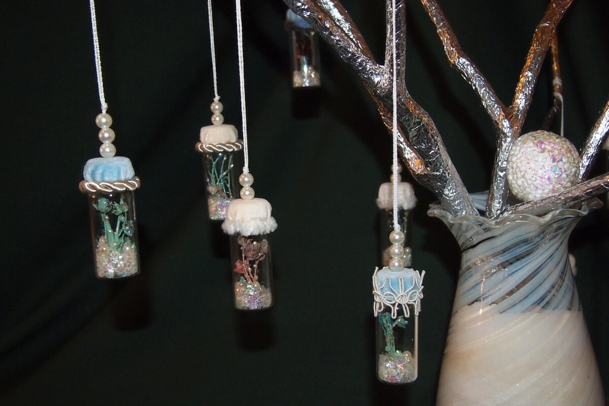 Увидела в магазине игрушки на ёлку в виде аптечных пузырьков. И захотела сделать аналогичные. Пузырьки у меня были. От кошачьего лекарства. Правда, они чуть меньше магазинных. Чем наполнила бутылочки Взяла насушенную малину. Выбрала ягодки и симпатичные былинки (ростом не более 4см). Покрасила лаком для ногтей. Добавила блестяшек и слепила букетики. Клеила, как всегда, Титаном. Высота букетика - 3см. Приклеила пуговичные платформочки и искусственный снег. И ещё бусинок накидала. Тут две картинки, листайте. Чем накрыла бутылочки Из бархатных лоскутков вырезала кружочки для шапок (диаметр - 4см). Верёвки - корд от шторной ленты (40см). Собрала вот такие заготовки. Надела на пузырьки. Срезы стянула вокруг горлышков. Потом эти участки декорировала. По-разному. Сверху на верёвки нанизала бусины и зафиксировала узлами. Куда повесила бутылочки На мои серебряные ветки. Вот такие симпатичненькие флорариумы у меня получились. Да, в вазу для устойчивости насыпала соль. Тимыч один раз навал
