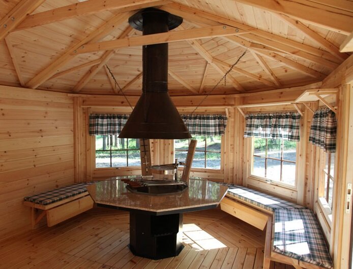 Печь – распространенный элемент пространства деревянной беседки. Последняя умеет беречь тепло, а первая – тепло предоставляет. Если печь кроме топливника снабжена мангалом, она будет радовать шашлыком и другими пикантными блюдами круглый год. Виды деревянной беседки Натуральность и текстура лесного массива привлекают по умолчанию. Но древесину также очень легко обрабатывать, что положительно сказывается на строительстве деревянных конструкций. Среди тематических беседок дачник вправе выбрать: Перечисленные конструкции разнятся между собой по способу возведения и форме, однако площадь внутреннего пространства везде одинаковая – 6-12 м². Этого вполне достаточно для уютного отдыха зимой и небольшого веселья летом с возможностью проходить мимо мебели и очага. Бревенчатый сруб долго возводится и оказывает большую нагрузку. Поэтому он требует ленточной подложки. С другой стороны, такая конструкция хорошо противостоит морозам и механическим нагрузкам. Виды печи Выбор печи во многом зависит от