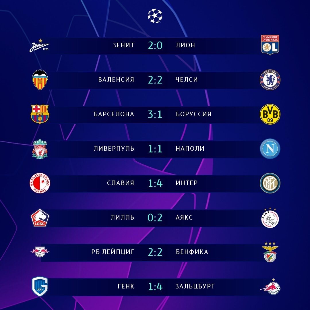 Результаты матчей среды в Лиге Чемпионов: