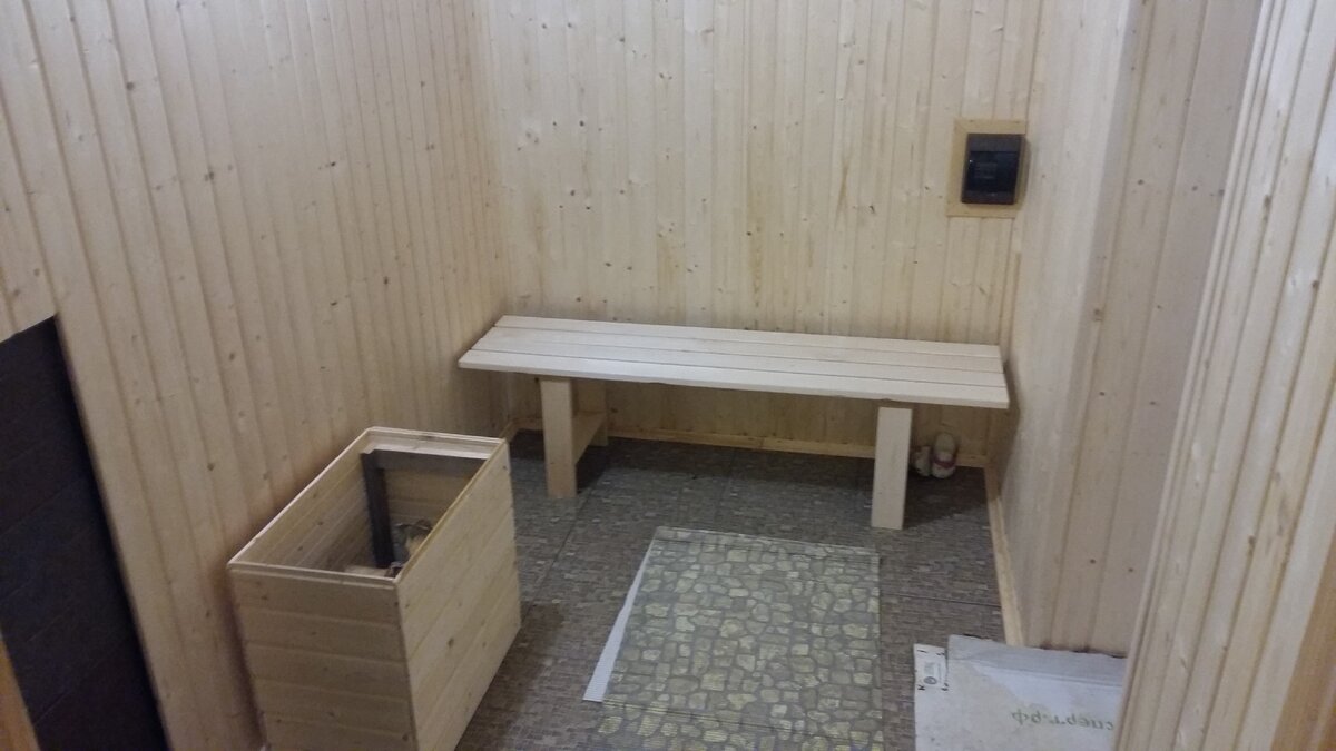 Я считаю так: предбанник нужен для того чтобы, комфортно приготовится к банным процедурам. Прийти, раздеться, чтобы не было холодно, если это зима и в тоже время не слишком жарко. Тут важно не сравнивать комнату отдыха, где можно полежать после парной, попить свежезаваренного чая. В этой бане, нет комнаты отдыха, так захотел хозяин. Этот предбанник не большой и не маленький, для семьи из четырех человек, самые подходящие размеры. Длина 2.28 см. Ширина 1.67 см. Высота 2.87 см. Весь предбанник, обшит сосновой вагонкой. По электрике, стоит щиток с вводными автоматами. Банный влагозащищенный светильник. На полу плитка. Печь топится из этого предбанника. Пространство вокруг печи, отделано плиткой. Самодельная дровница, сделана из остатков вагонки. Входная пластиковая дверь. Дверь в мойку, стеклянная. Купленная вешалка. Самодельная лавка. Вытяжка. Единственный спорный вопрос, нужно или нет, делать плинтуса по полу? так как в бане повышенная влажность, а это место самое благоприятное для появ