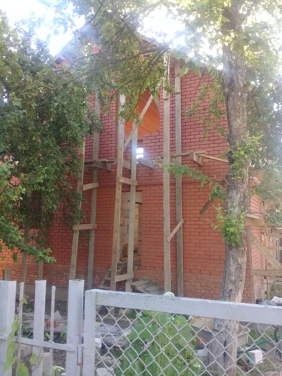 При строительстве межэтажного перекрытия предусмотрел выпуски бруса для последующего обустройства балкона. Брус использовал 100х200 мм., выпуск бруса 90 см. Доски использовал, оставшиеся от строительных лесов и опалубки. Брус для сборки каркаса использовал из остатков прошлой стройки. *Электрорубанком обновил "беушный" строительный материал, зачистил ножом места образования гнили и залил их антисептиком. Древесина стала как новая. Перед началом сборки балкона брус промазал отработкой масла (несколько раз). На брус настелил доски 50х150 мм., низ доски обработал так же как и брус. Сверху доски промазал антисептиком. По краям балкона к стене дома (вертикально) закрепил доски, при этом крепил не к кирпичной стене, а в газоблочную стену (три точки крепления на каждую доску). Далее принялся за выставление столбов из бруса 150х150 мм по краю настила. С выставлением крайних столбов проблем не возникло, т.к. они короткие и легкие. Столб к настилу крепил следующим образом: в центре торца б