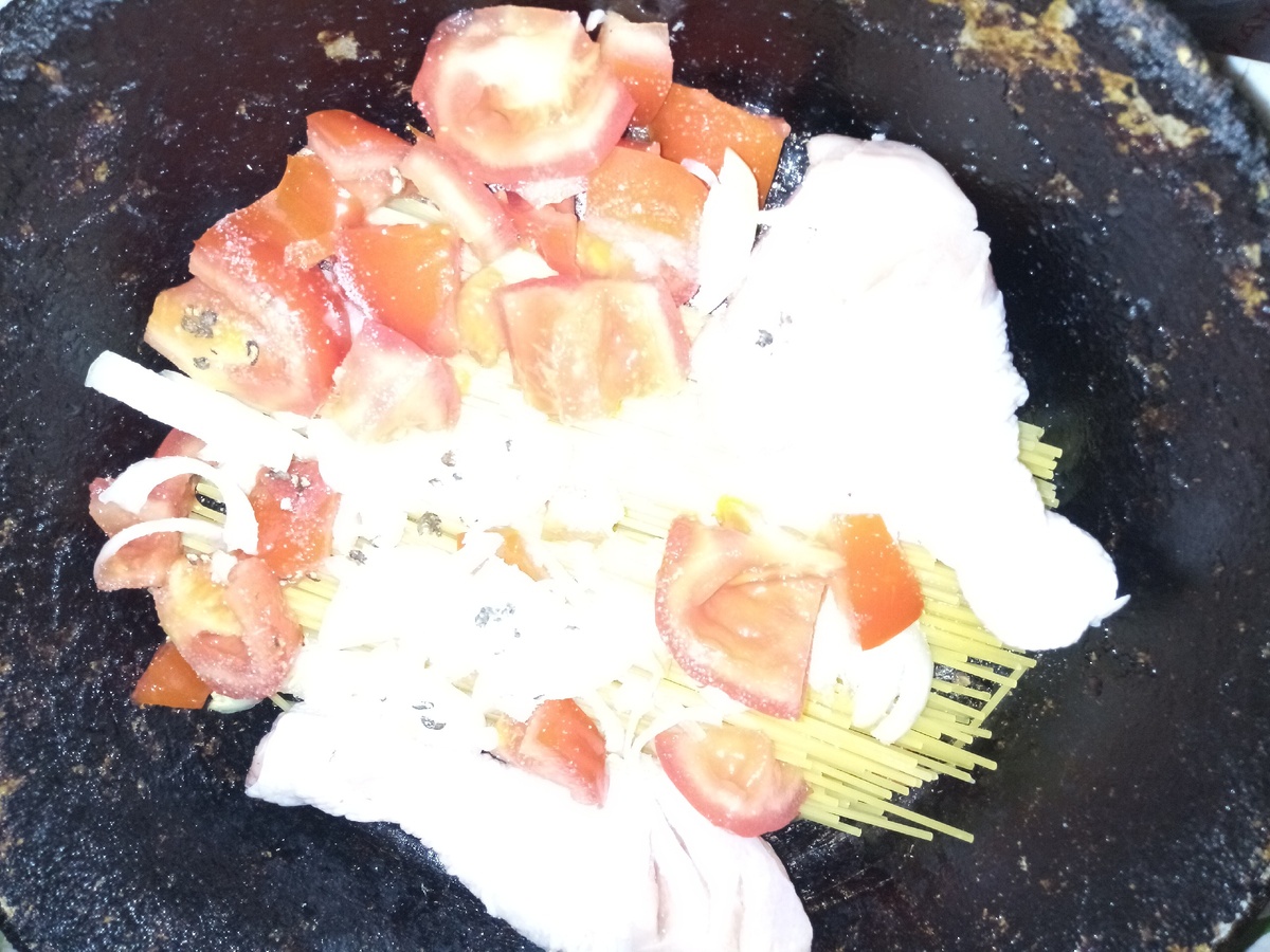 Паста в одной сковороде с небольшим бюджетом. Возможно ли это? Конечно да! И сегодня я расскажу как провернуть этот фокус. Ингредиенты: Спагетти - 150г Две куриных ножки Томат - 1 шт лук - 1 шт Чеснок - 1шт. Перец подавленный - 8 горошин. Щепоть соли. Готовка ! 1.В сковороду закладываем спагетти. 2. томатный помидор нарезанный абы как тоже отправляется в пекло. 3 лук режем тонкими полукольцами, если нарежьте тонко, то даже не заметите варёный лук. 4 чеснок так же режем и отправляем 5. Выкидывает подавленный чеснок и щепоть соли. 6 голень предварительно порезать чтобы полностью сварилось. 7 заливаем водой чтобы покрывало спагетти + 2 см и варим 25 мин иногда помешивая. А вот и результат. Спасибо большое за просмотр
