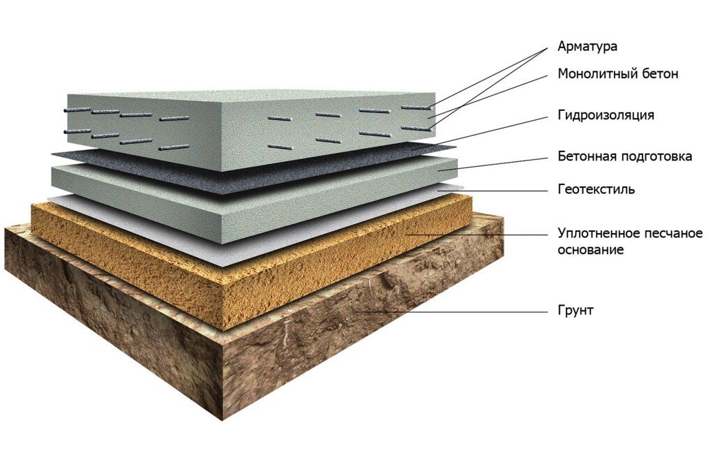 Оригинал статьи на моём сайте Монолитная плита – это пожалуй наиболее надежный тип фундамента. Обычно такой тип фундамента проектировщики выбирают если предполагаемое строение планируется к строительству на участке со сложным грунтом. В основном монолитную плиту делают при заболоченных участках, мягких грунтах с близким расположением грунтовых вод, или на торфяниках. При пучении почвы, такой фундамент плывёт приподнимаясь и опускаясь. На глаз конечно этих колебаний не видно. Основание представляет собой железобетонную плиту. Монолит защищает стены от деформации. У монолитной плиты есть и свои минусы, ведь после её обустройства, подвальное помещение или цокольный этаж невозможен. Как правило тогда из плиты делают пол опуская его ниже. Тем самым плита делается заглублённой. При устройстве монолитной фундаментной плиты требуется подушка из песка. Песок проходит обработку трамбованием, тем самым уплотняя песчаную подушку. Потом песчаное основание необходимо п