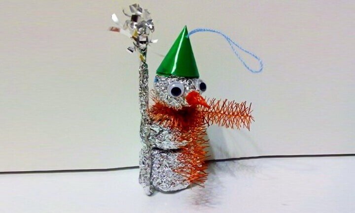 Самая простая поделка из фольги, которую легко смастерит даже ребенок. Снеговик получается очень симпатичным – его можно повесить на елку, использовать в качестве работы на конкурс или подарить.