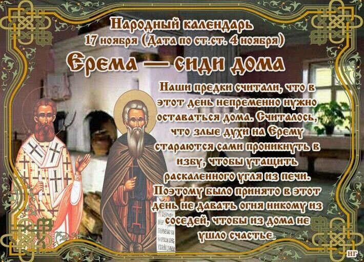 «День домоседа» отмечали 17 ноября (4 ноября по старому стилю) в старину православные верующие Российской империи, приговаривая «Ерема, сиди дома!» Считалось, что иначе можно было прямо у порога, не говоря уже про двор, столкнуться с нечистой силой и навлечь на себя, свою семью различные серьезные неприятности, сообщает корр. РИА Биробиджан. «Призрачны околицы в этот день», — говорили в деревнях. И погода зачастую была под стать общему настроению: «По-за порогу крутит, мутит, беспутит». Считалось также, что злые духи на Ерему стараются сами проникнуть в избу, чтобы утащить раскаленного угля из печи. Поэтому было принято в этот день не давать огня никому из соседей, чтобы из дома не ушло счастье. Более того, домашние просили: «Светец, крепко держи лучину, чтобы ни нагаринки из избы не утянула нечистая сила». Но причем же здесь Ерема? По церковному календарю в этот день вспоминали двух священномучеников — Никандра, епископа Мирского, и пресвитера Ермея. По преданию, оба они были ученикам