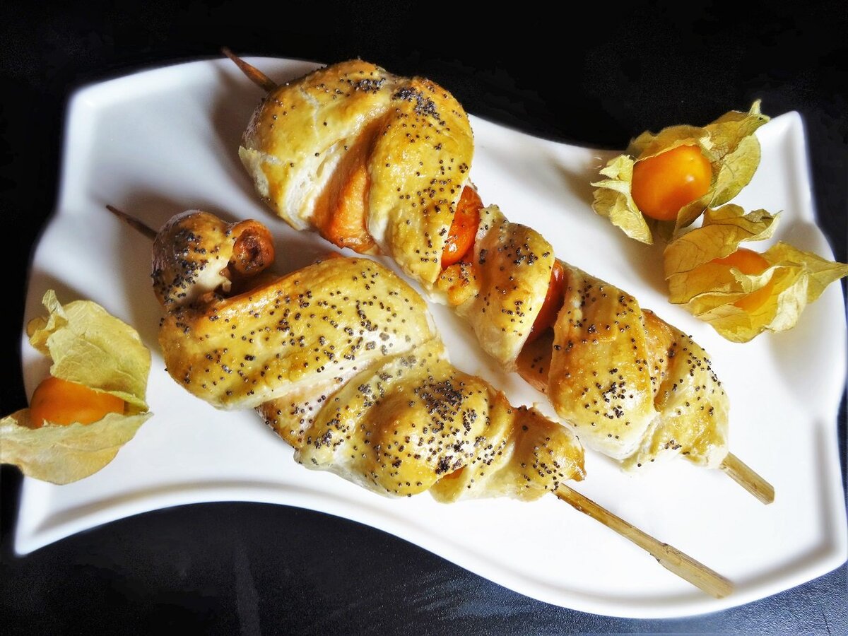 В выходные дни на меня накатывает желание приготовить что-то новое, красивое, вкусное. Но при этом, не затрачивая много времени и сил, не пачкая гору посуды. #это не просто завтрак Сегодня я поделюсь с вами одной находкой, надеюсь, и вам это блюдо понравится. Блюдо-сюрприз! Шашлычки под слоёным тестом! И что бы вы ни нанизали на шпажку, прикрыв ингредиенты полосой слоеного теста, для едоков содержимое останется загадкой до последней минуты. Можно это блюдо готовить много раз, импровизируя с набором продуктов. Разве сразу определишь, что я скрыла под тестом? Но, по-настоящему удивить можно лишь уединившись на кухне, чтобы никто не подглядел, над чем вы колдуете Мой набор продуктов: Для маринада: Моего набора продуктов хватило на 6 шпажек Приготовление: Готовим составляющие шашлычка: