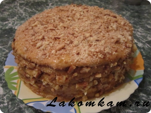 Ингредиенты: яйца — 2 штуки; сахарный песок — 1 стакан; мед — 3 столовые ложки; масло сливочное — 100 грамм; мука — 3,5 стакана; сода пищевая — 0,5 чайной ложки; соль — щепотка; крем №1 — 1 банка вареной сгущенки; крем №2 — 1 стакан густой сметаны смешиваем с 0,5 стакана сахара; крем №3 — 1 лимон пропускаем через мясорубку и смешиваем с 0,5 стакана сахара; посыпка — 1 стакана дробленых грецких орехов.