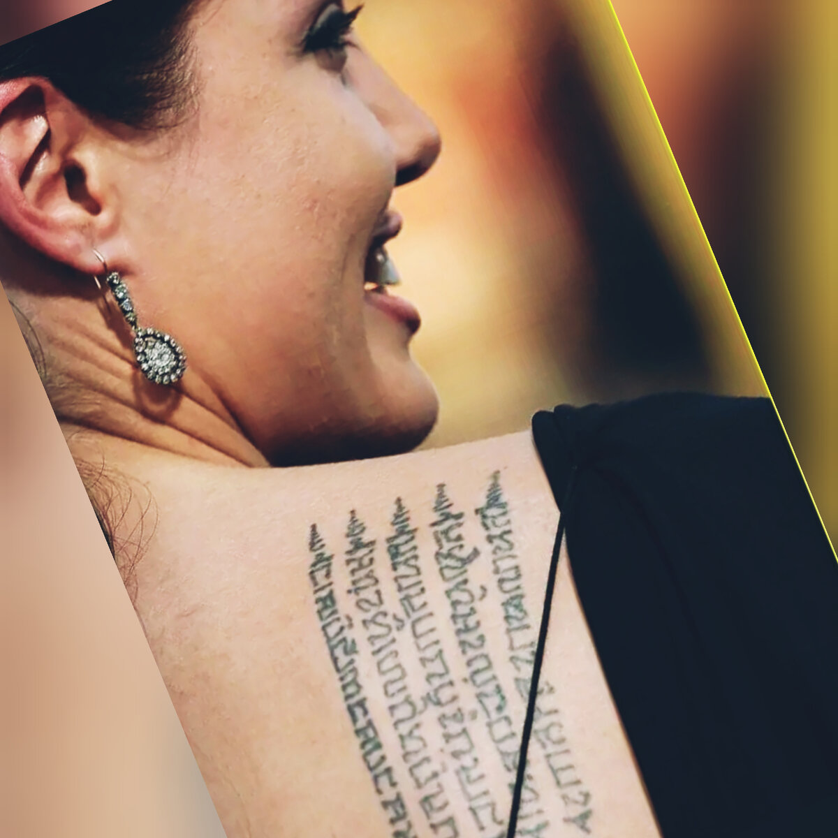 В фильмах Анджелины не особо то заметно татуировки, многие даже не догадываются, как много всякого написано на её теле. А ведь Джоли любит самовыражаться с помощью тату и у нее их около 10 штук. При этом каждая имеет смысл, историю и тесно связана с жизнью актрисы. Давайте же посмотрим на наиболее заметные и интересные. 1. Древняя буддийская надпись Это защитная татуировка «Тай молит о защите», выполненная в стиле, который используют в Камбодже. Этот стиль был выбран не случайно, старший сын Анджелины - Мэддокс, как Вы уже догадались, родился именно там. Так она хотела защитить себя и старшего сына. Перевод написанного: Да устрашаться твои враги тебя, да пребудут с тобой все богатства твои, красота твоя сравнится с Апсарой, и да защитит он тебя, где бы ты ни был. Так же интересно, что эта тату была нанесена поверх другого - слово на китайском языке, означающее «смерть». 2. Любимая песня У самого основания шеи красуется название песни ее любимой группы Clash «Know Your Rights», пер