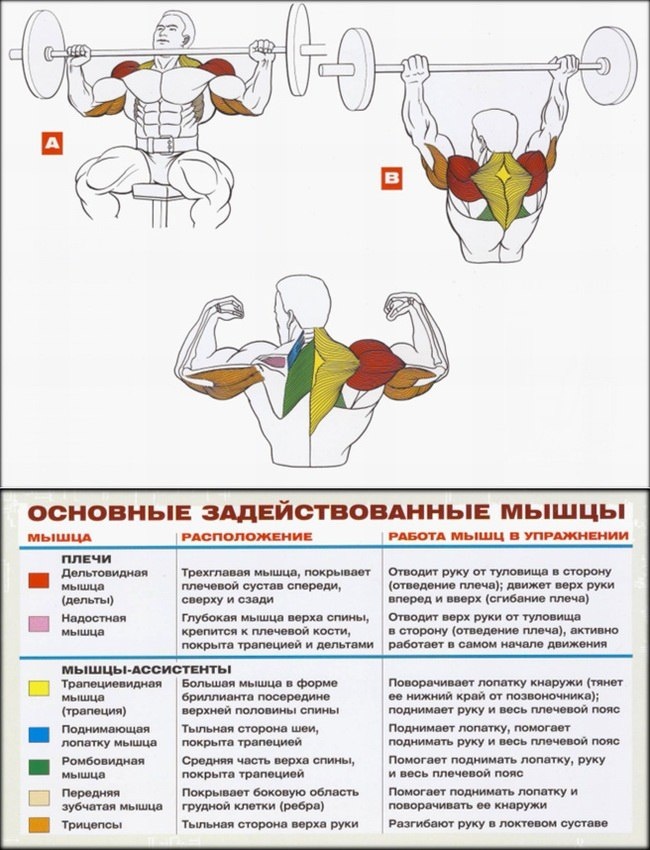 Лучшие упражнения для плеч Считается, что плечам легко придать форму, но сложно добавить объем. Обычно тренинг начинается с базовых для плеч жимов (армейского жима штанги или жима Арнольда с гантелями), являющихся главными упражнениями для придания плечам массивности. Лучшее базовое упражнение для плеч - жим Арнольда стоя. После жима Арнольда стоя, отдохните 2 минуты и начитайте выполнять разведения гантелей стоя. Задняя часть дельт прорабатывается разводками гантелей в наклоне, передняя — подъемами гантелей перед собой. Для всех этих упражнений существуют аналоги, выполняемые на тренажерах, однако работа со свободными весами более эффективна на первых порах. Широкие плечи: секреты техники Поскольку в мускулатуре плеч преобладают быстрые мышечные волокна, для их роста отлично подходит так называемый «пампинг», заключающийся в выполнении упражнений с маленьким весом и высоким количеством повторов (порядка 12-15). В начале тренировки дельт выполняются одно-два базовых упражнения с пов