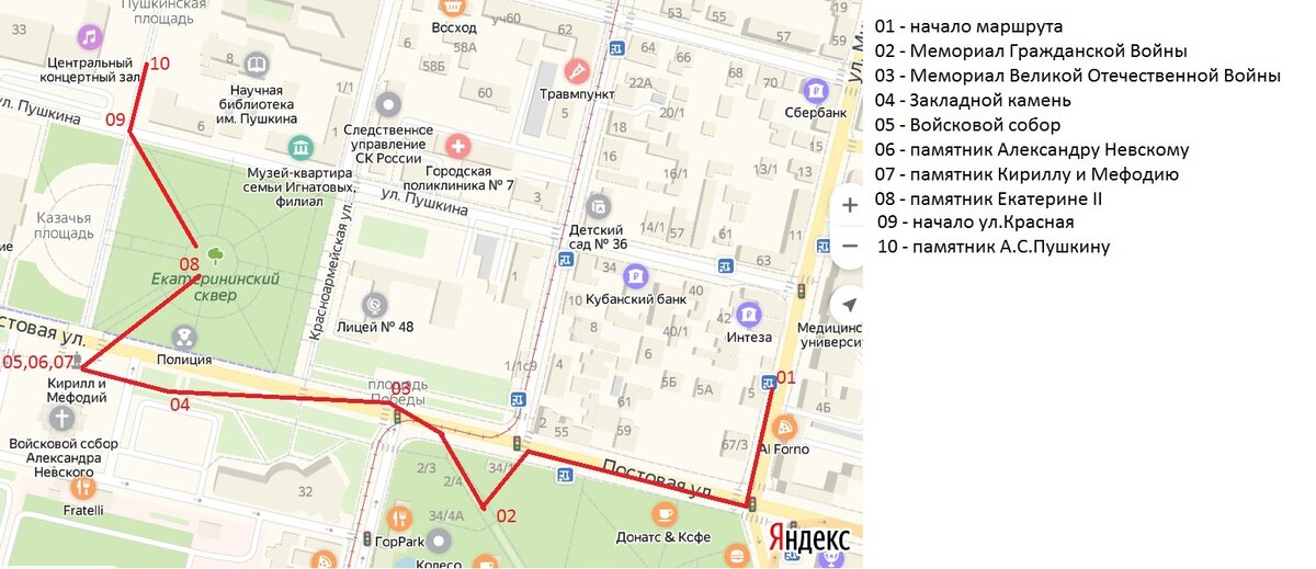 Для вашего удобства, все памятные места пронумерованы. В предыдущей статье мы рассказали как началась наша экскурсия по Краснодару. И так продолжаем. Мы вышли из Екатериниского сквера и через Пушкинскую площадь (10), подошли к пешеходной части улицы Красная, главной в Краснодаре, да и наверное самой красивой, соответствующей своему названию.(09) По выходным и праздникам движение транспорта на большом участке этой улицы перекрывают и она отдается во власть пешеходам и велосипедистам. Дома - абсолютно разной архитектуры и разных лет постройки, но все по своему замечательные. По всей улице много магазинов, ресторанов и кафе от дорогущих до обычного фастфуда. Здесь же в одной из кафешек мы и пообедали. Пройдя около одного километра от Екатерининского сквера, попадаем в другой сквер, тоже имени нашего великого соотечественника, но уже советской эпохи, в сквер имени Г.К.Жукова. В сквере находятся бюст полководца и мемориальная стена с именами краснодарцев, погибших в Великую Отечественн