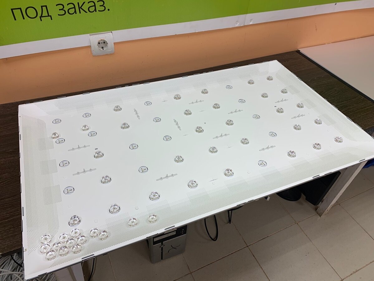 Приступаем к разборке, снимаем заднюю крышку, далее переходим к разборке матрицы, очень аккуратно снимаем стекло, далее светофильтры и вот оно: мы добрались до подсветки, где валяются отклеившиеся линзы. Другие линзы тоже еле держатся, будем переклеивать все. Как все переклеили, даём клею встать, далее проверяем есть ли пятна. Пятен нет, приступаем к сборке телевизора. Включаем, проверяем: ни пятен, ни засветов нет! Ремонт телевизора LG 49LB620V выполнен!