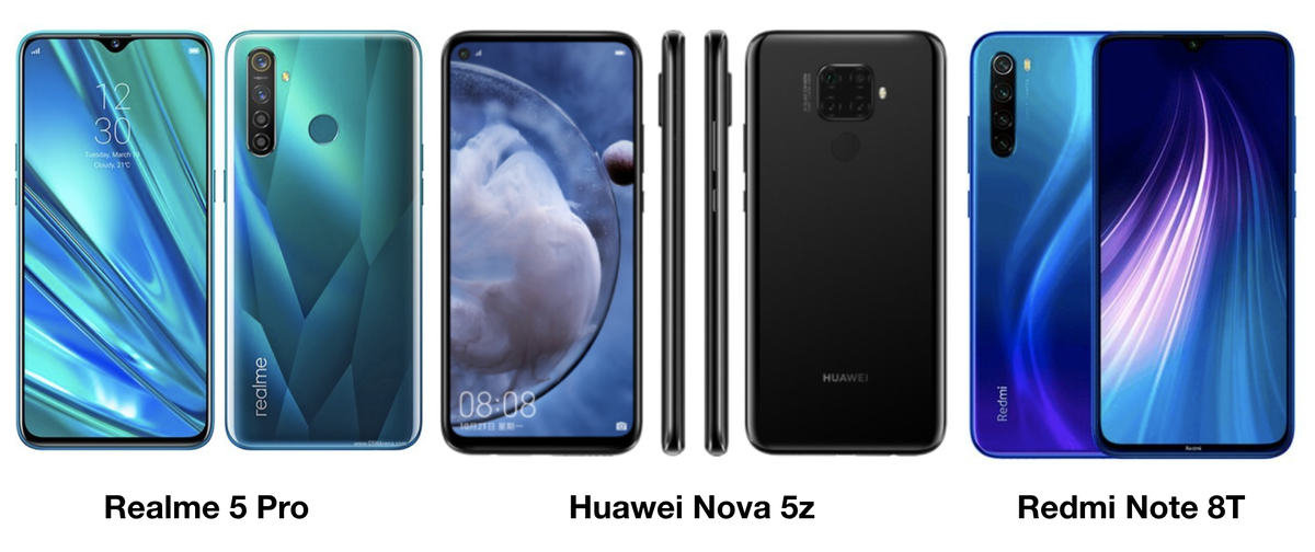 Вышедшая во второй половине текущего года модель смартфона от суббренда Xiaomi - Redmi Note 8 наконец-то была доработана до глобальной версии и получила название Redmi Note 8T. Основное отличие двух вариантов одного смартфона состоит в наличии NFC. Вместе с тем, в настоящее время на рынке присутствуют два конкурента для этой модели, выпущенные компаниями Huawei и Realme - суббренд компании Oppo. Эти модели носят названия: Realme 5 Pro и Huawei Nova 5z. На мой взгляд эти два смартфона наиболее удачно сочетают в себе соотношение цены и качества, а потому будет интересным сравнить все три модели и выяснить, какая же из них может стать лучшим вариантом при выборе устройства мобильной связи среднего класса. Более интересной моделью на первый взгляд можно назвать Huawei Nova 5z. Если дизайн исполнения Realme 5 Pro и Redmi Note 8T примерно одинаков: стеклянная задняя поверхность, расположение основного модуля камеры, пластиковая рамка и каплевидный вырез в дисплее под фронтальную камеру, то