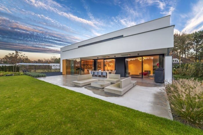 Семья высказала желание сохранить максимальную приватность и в то же время иметь панорамные виды. Для этого на боковых стенах этого современного особняка спроектированы длинные узкие окна шириной 50 сантиметров, которые смотрятся, как точные разрезы на теле. В кабинете установлено длинное 8-метровое окно, что позволяет наслаждаться панорамными видами, не вставая из-за рабочего стола.
