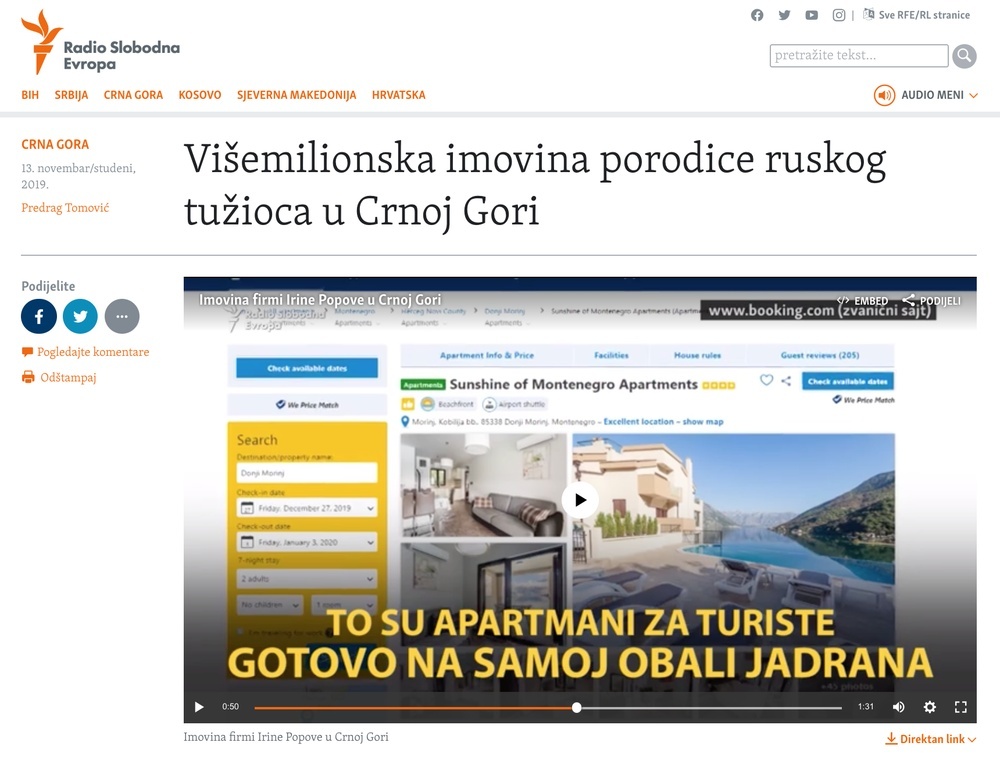 Почему прокурор Москвы, получая взятки, инвестирует их в недвижимость в Черногории, а не в Крыму или Сочи? Больше солнца, ближе НАТО, перспективы вступления в Евросоюз, есть судебная система, нет «Единой России», теплое море и прекрасные дружелюбные соседи. Последнее часто подчеркивают. Черногорцы, правда, весьма дружелюбные чуваки (хотя с этим сильно спорят хорваты). Однако в нашем случае дружелюбие и добрососедство подвело прокурора города Москвы. После выхода нашего расследования журналисты радио «Свободная Европа» поехали на место и просто обошли соседей с фотокарточкой нашего прокурора. Вдруг мы врём и не было там такого никогда. Не врём. Соседи расплывались в улыбке и отвечали: ну как же, знаем. Постоянно видим. Замечательный сосед. Это дом его семьи, который они сдают на лето. По соседству с Ириной Поповой Жительница Моринь Гордана Сеферович Раденкович, которая живет рядом с домом, принадлежащим Ирине Поповой, говорит, что встретила своих соседей и подтверждает RSE, что дом исп
