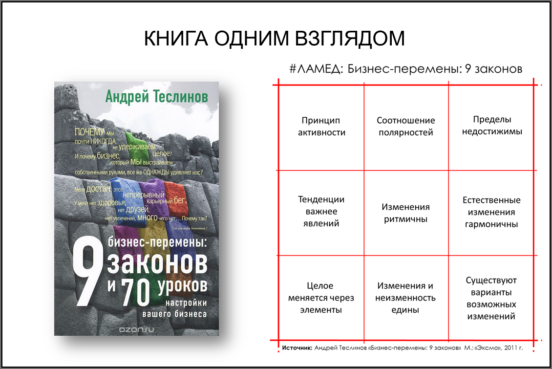 Если вы хотите получить общее представление о книге одним взглядом, то можете взглянуть на Матрицу составленную из главных идей - девяти идей, которые удивительным образом укладываются в матрицу 3х3 без остатка. Каждая идея включает в себя закон, противоречие, наблюдения из бизнеса и рекомендации по применению. Прочитав данную книгу хотелось познакомиться лично с автором, что я и сделал на конференции "Никаноровские чтения". В этом же выпуске я хочу отметить отдельные моменты перемен.