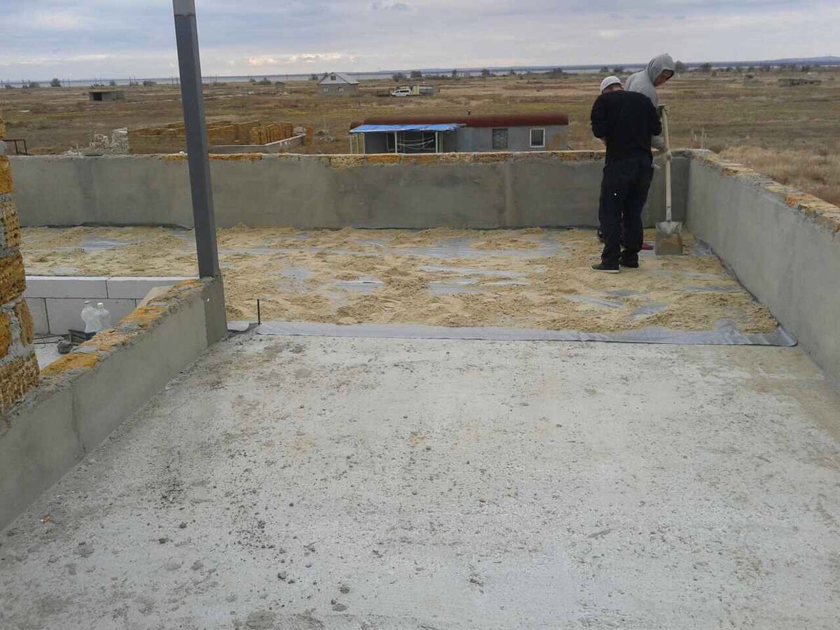 На дворе конец октября 2017 года. Скоро могут пойти дожди, поэтому на до приступать к кровле. Как я писал в своих статьях, у меня будет эксплуатируемая плоская кровля. Приступаем. Первый слой - пароизоляция. Дальше, качестве утеплителя, слой пенопласта 50 мм и слой пенополистирола 50 мм. Утеплитель будет работать больше как защита от палящего солнца, так как плоская кровля летом будет сильно нагреваться. Дальше делаем армированную бетонную стяжку с разуклонкой, чтобы дождевая вода стекала в одно место на южную сторону и по желобу дальше в землю. Дальше наносим праймер для кровли на битумной основе. Благодаря его помощи имеется возможность подготовить основание крыши для укладки кровельного материала После праймера наплавляем два слоя рубемаста. Смотрите как получилось Основная крыша закрыта, также предстоит накрыть выход на кровлю и жилую комнату 2-го этажа предварительно собрав стропильную часть и накинув утеплитель. Наступил ноябрь 2017 года, крыша покрыта, дождик не страшен. Можно