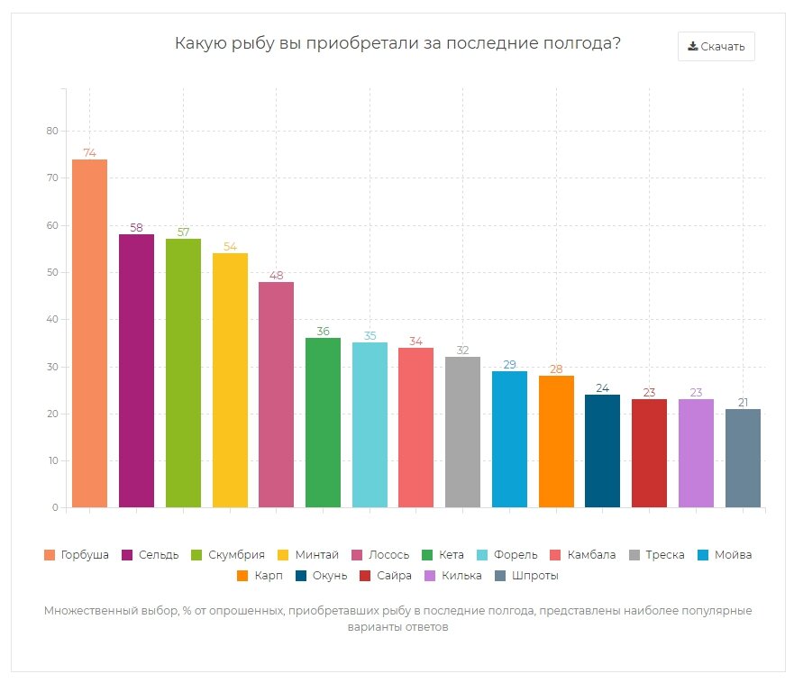 Чаще всего россияне покупают горбушу, однако предпочтения существенно различаются в зависимости от дохода и места проживания опрошенных. Предлагаем фрагмент исследования потребительских предпочтений на рынке рыбы и морепродуктов. Список 15 самых популярных ответов на вопрос «Какую рыбу вы приобретали в последние полгода?» выглядит так: Это обобщенные данные, которые представляют общую картину по стране. По ссылке — результаты в разрезе дохода и размера населенного пункта опрошенных, они различаются весьма существенно. Выборка исследования В ходе исследования было опрошено 2400 человек. Выборочная совокупность строилась согласно квотам по полу, возрасту и месту жительства респондентов в соответствии с социально-демографическими характеристиками населения России. В исследовании принимали участие жители городов РФ с населением от 100 тыс. чел.