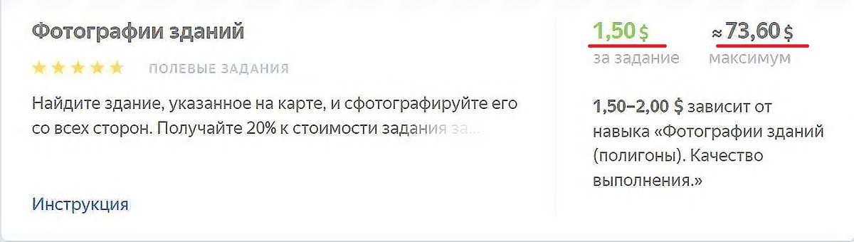 О том, как зарегистрироваться в Толоке читайте ниже, а для начала давайте посмотрим какие задания есть на платформе. Работы на Толоке делятся на пешие и домашние. Самый большой заработок в день сегодня приносит пешее задание "Фотографии зданий." Обратите внимание на две суммы, указанные в карточке задания (см рисунок ниже). Первая сумма - 1,5 доллара - это плата за одно задание, а вторая сумма - 73,60$ - столько заработали в среднем самые активные исполнители этого задания в день. То есть сегодня за этом задание самый шустрый пользователь заработал примерно 4700 рублей, что при 20-дневном рабочем месяце составит около 94000 рублей в месяц.