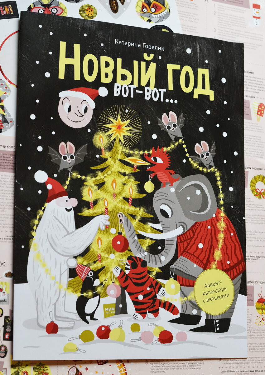 Это первый адвент-календарь не только в жизни моей 4-ех летней дочки, но и в моей. Я, конечно, о них слышала, но никогда раньше не пользовалась. Сразу скажу – классная это идея. Мне понравилось! Какие-то задания мы делали быстро, с какими-то пришлось повозиться. Но и процессом, результатами я очень довольна. Наш первый календарь от издательства «Манн, Иванов и Фербер» «Новый год вот-вот…» Катерины Горелик. Основа календаря – лист А2 формата, сложенный пополам. Сам календарь – внутри. Нарисован домик с красной дверкой и 13 окошками. Дверка и окошки открываются. И за каждым из них свои жильцы и своя история. Моя дочка обожает книжки с окошками. А еще наклейки. В комплект к календарю идут 2 листа с инструкциями и заданиями и 1 лист с наклейками. Наклейки надо вклеивать в календарь после выполнения задания. Так что тут сплошные удовольствия для ребенка: крупные рисунки, смешные герои, невероятные истории, а еще окошки и наклейки. Заданий всего 14. Они составлены в 2-ух возрастных варианта
