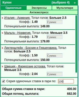 Всех приветствую! Начало новой недели, в прошлой вышло неплохо заработать - статистика здесь Прогноз на сегодня Italy - Armenia > over (ТБ 2.5) Liechtenstein -Bosnia & Herzegovina > over (ТБ 2.5) Malta - Norway > under 3,5 (ТМ 3.5) Sweden - Faroe Islands > under 3,5 (ТМ 3.5) Статистика за первую неделю - здесь Все актуальные прогнозы на моем канале и в соц.сетях - подписывайся! Всем удачи!