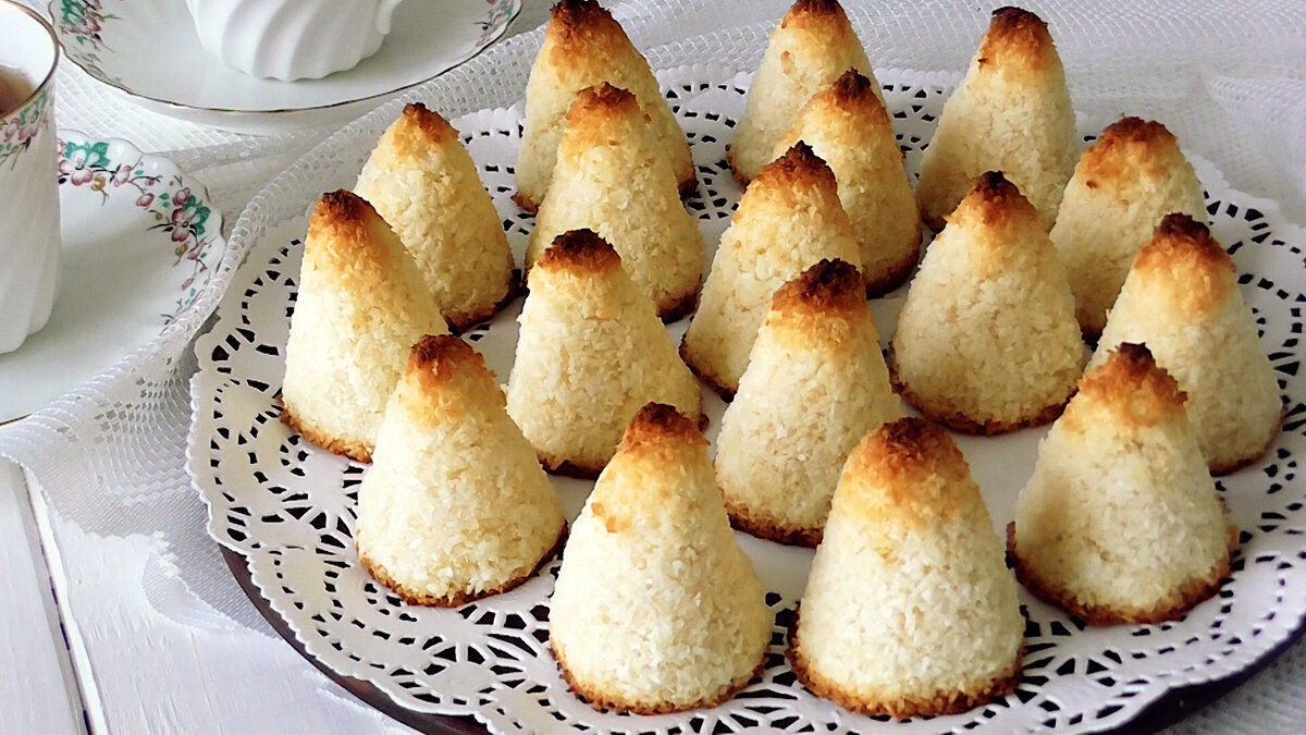 Всем привет! Я очень люблю выпечку с кокосом за её легкий и нежный аромат. А этот рецепт из разряда всё смешал и испёк. С приготовлением такого десерта к чаю справится даже ребёнок, ведь для этого понадобится всего три ингредиента! На вкус оно нежно- хрустящее снаружи и мягкое ароматное внутри. Это поистине райское наслаждение! Короткое видео по приготовлению🎬 Ингредиенты📝 -3 яйца -120 гр сахара -250 гр кокосовой стружки Приготовление✅ 1.Яйца взбить с сахаром около 1-2 минут. 2.Высыпать сразу всю кокосовую стружку и перемешать ложкой. 3.Оставить на 5 минут, чтобы стружка разбухла. 4.Слепить пирамидки или шарики. Я в этот раз решила сделать в виде конусов, уж очень мне хотелось именно такой формы! И для этого из фольги и картона сделала формочку-заготовку. Слегка смачивала её водой и заполняла массой. 5. Выпекать в хорошо разогретой духовке при 180С около 15-20 минут. Всем приятного и вкусного чаепития! Подписывайтесь на канал🔔, ставьте лайки👍 и пишите свои комментарии!✍