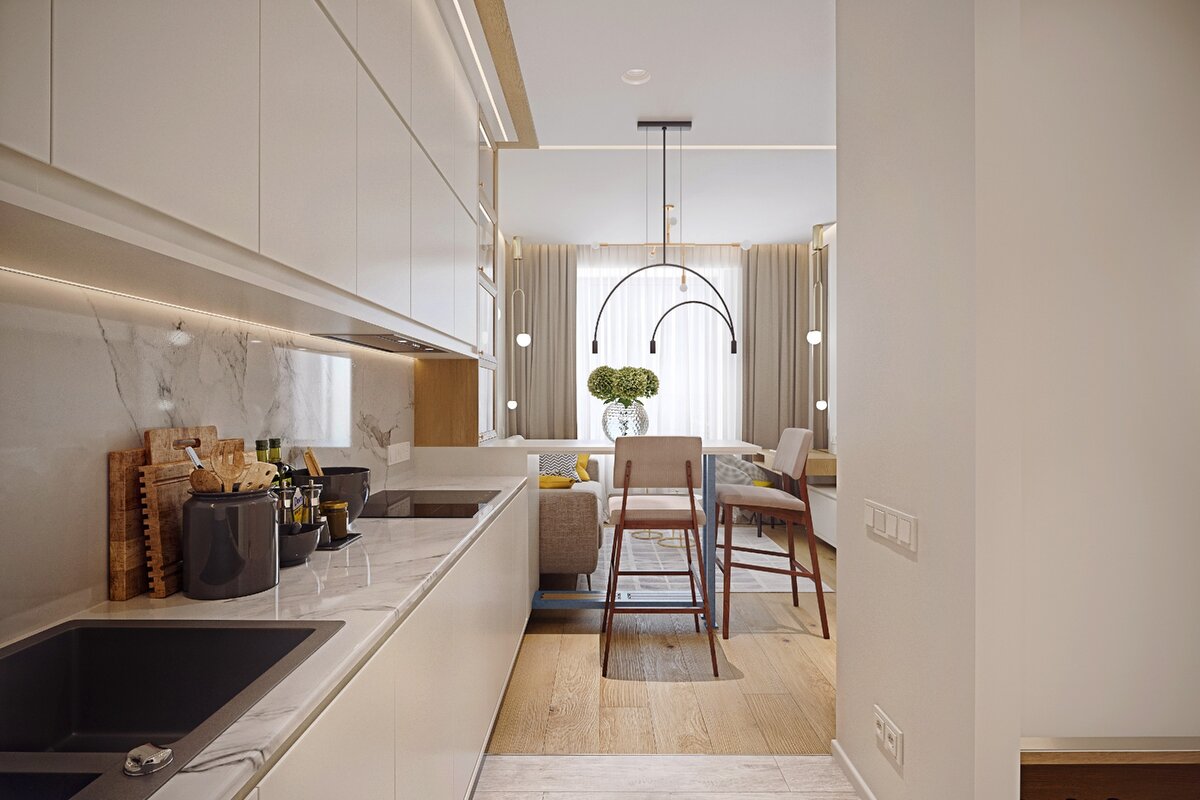 В этом проекте мы придерживались современного стиля, спокойных и светлых тонов. На небольшой площади мы реализовали стильный, уютный и функциональный интерьер. При проектировании небольших помещений с большим функционалом, необходимо помнить, что нельзя перегружать пространство. 💫 Фишка нашей работы в том, что мы сделали максимально светлое и просторное пространство за счет большого количества белого, добавления небольших акцентов не по стенам, а по декору и окружающим предметам. 💫 Деревянный пол красиво сочетается со вставками в интерьере. Минимальное количество сложных форм смотрится очень стильно. 💫 Для светлого и уютного помещения был выбран белый пол из керамогранита в холле и на кухне от tile.expert/ru 💫 Освещать комнаты в темное время суток будут встроенные светильники в холле и на кухне от deltalight.com/ru, а обеденную зону украсил подвесной светильник от donolux.ru ⠀⠀