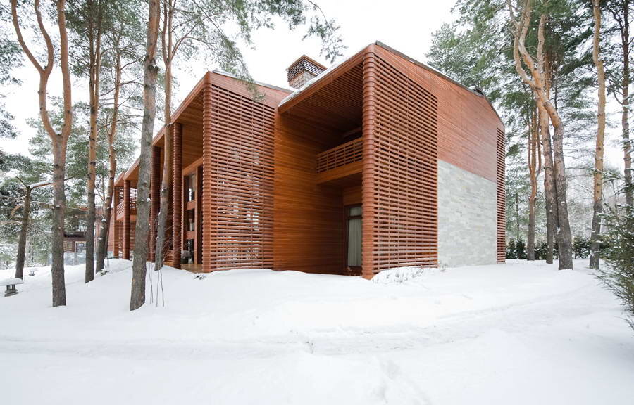Этот роскошный дом построен в подмосковной курортной зоне Пирогово. Дерево — любимый материал Тотана Кузембаева и здесь вновь продемонстрированы его возможности: фасады выполнены из деревянных элементов практически интерьерного качества, а декоративные решётки и колонны усиливают это ощущение, попутно корректируя масштабность здания. Индивидуальный загородный дом «Макалун» был возведен в 2008-2012 году на территории курорта «Пирогово» (Московская область). Дом представляет собой трехэтажное строение (два этажа над землей) в плане 30х16 м. Интерьеры разработаны с широким применением дерева и натурального камня. В качестве полов в жилых помещениях применена паркетная доска. В «мокрых» помещениях плитка из натурального камня и керамогранита, а также мозаика в зоне бассейна и при мастерспальне. Во всех основных помещениях потолки решены с применением декоративных балок из лиственницы с заполнением межбалочного пространства, потолочной шпунтованной доской из лиственницы. Стены обшиты парке