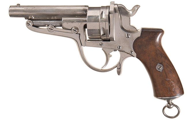 В 1868 году известный французский оружейник Шарль Франсуа Галан (Charles François Galand) вместе со своим английским компаньоном А. Соммервиллем (A. Sommerville) получил патент на разработанный ими оригинальный механизм извлечения стреляных гильз из револьвера. Извлечение гильз производилось при помощи укрепленного под стволом и рамкой револьвера рычага, который являлся частью предохранительной скобы. При опускании этого рычага вниз ствол и барабан сдвигались внутри рамки вперед. Почти сразу после начала движения звездчатый экстрактор, помешенный в заднем торце барабана, стопорился, в то время как сам барабан продолжал поступательное движение, и стреляные гильзы, будучи извлеченными из камор барабана экстрактором, просто выпадали наружу. Новые патроны вставлялись в барабан при выдвинутом экстракторе, а так как патрон с пулей был длиннее пустой гильзы, то они свободно доставали до камор. Полностью патроны входили в барабан тогда, когда его задний торец прижимался к щитку рамки револьвера, то есть при возврате в первоначальное положение.