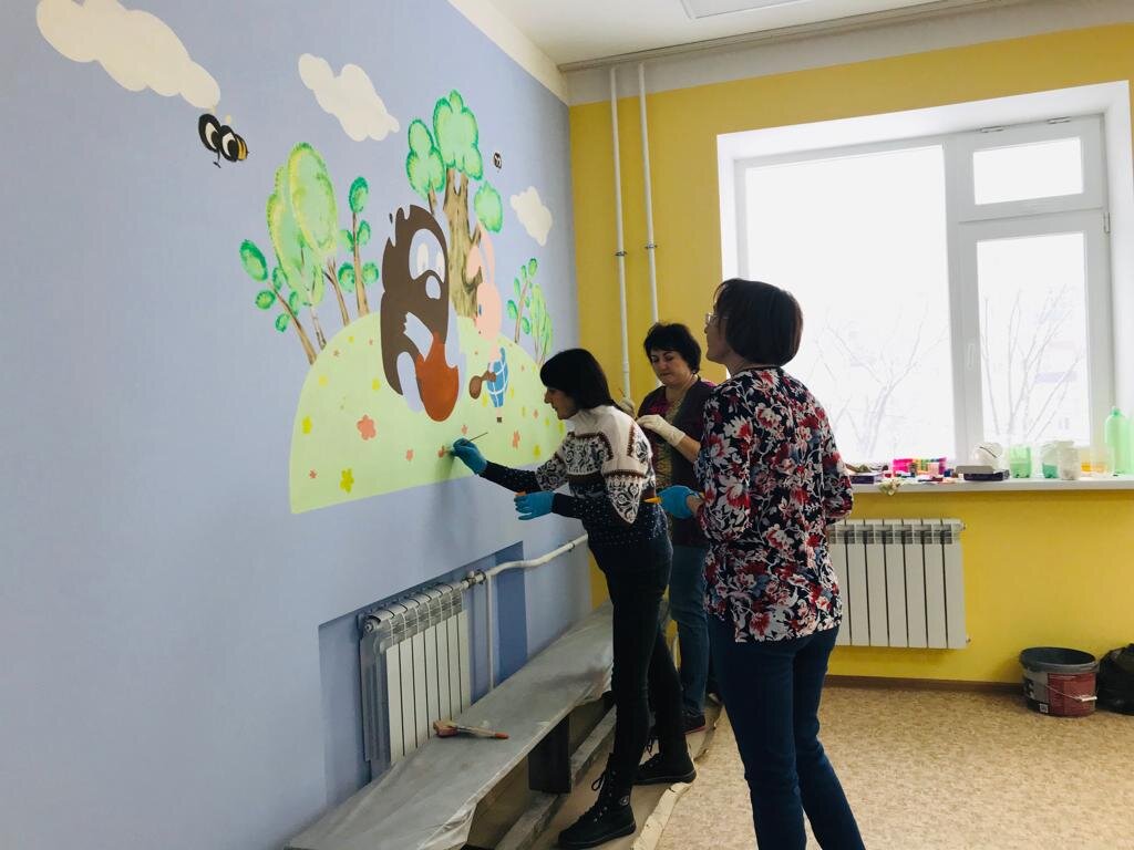 Лунтик, Колобок, Буратино, Смешарики: в новом детском саду в микрорайоне «Транспортный» декорируют стены. Иллюстрации персонажей из русских народных сказок, советских и российских мультфильмов появятся в каждой группе, сообщили в комитете по образованию, делам молодежи. – Над оформлением стен работают 8 преподавателей по ИЗО всех общеобразовательных учреждений города, а также воспитатели детских садов, имеющие соответствующее образование, – рассказала председатель комитета по образованию, делам молодежи Ирина Губина. – Художественные иллюстрации украсят 9 помещений игровых комнат, а также лестничные пролеты, актовый и спортивный залы. В каждом помещении групп расписывают стены по 2-3 педагога в свободное от работы время.