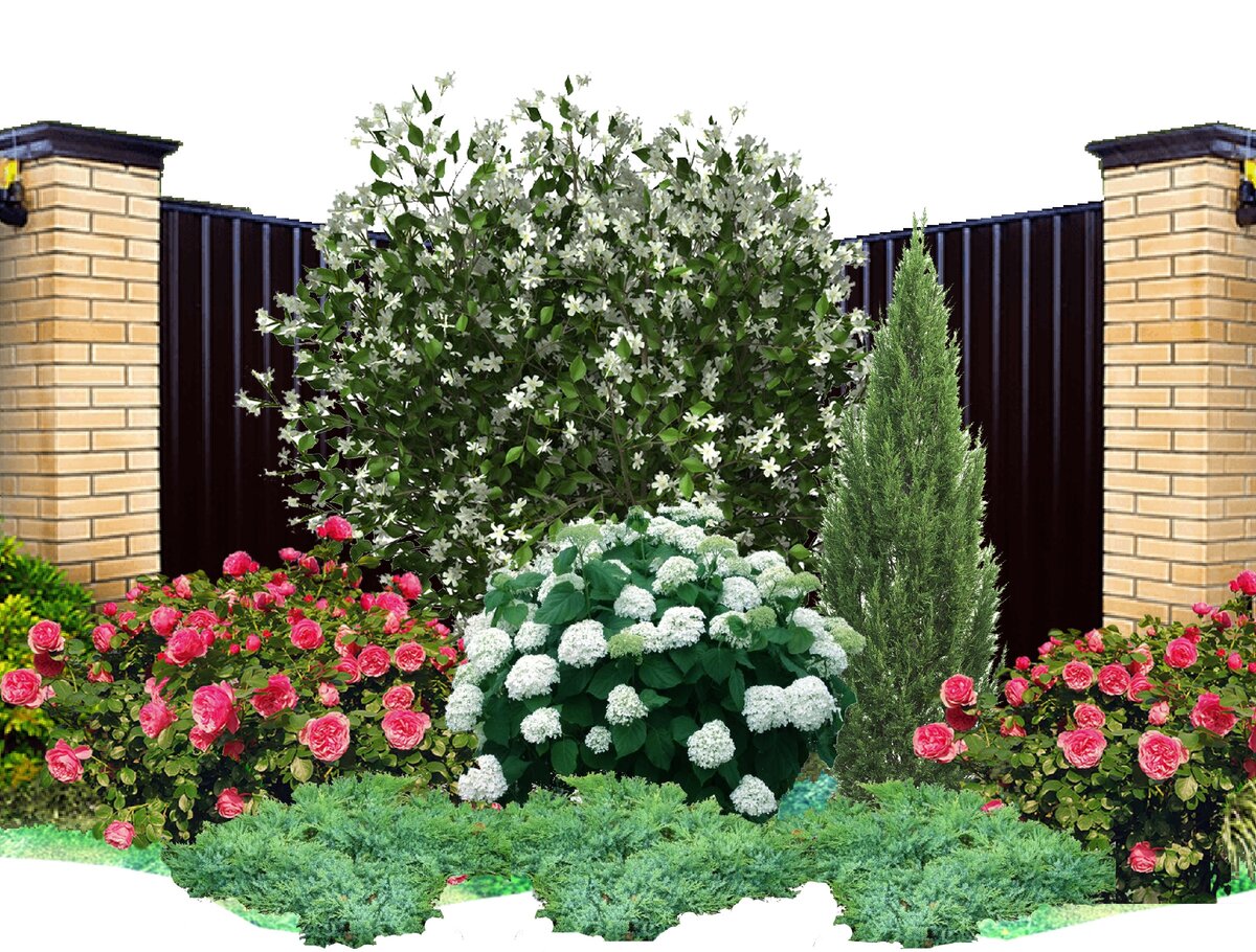Этот проект подойдет для открытых солнечных участок, сможет красиво задекорировать забор, скрыть неприглядный угол, добавит благоухания и яркости вашему саду.