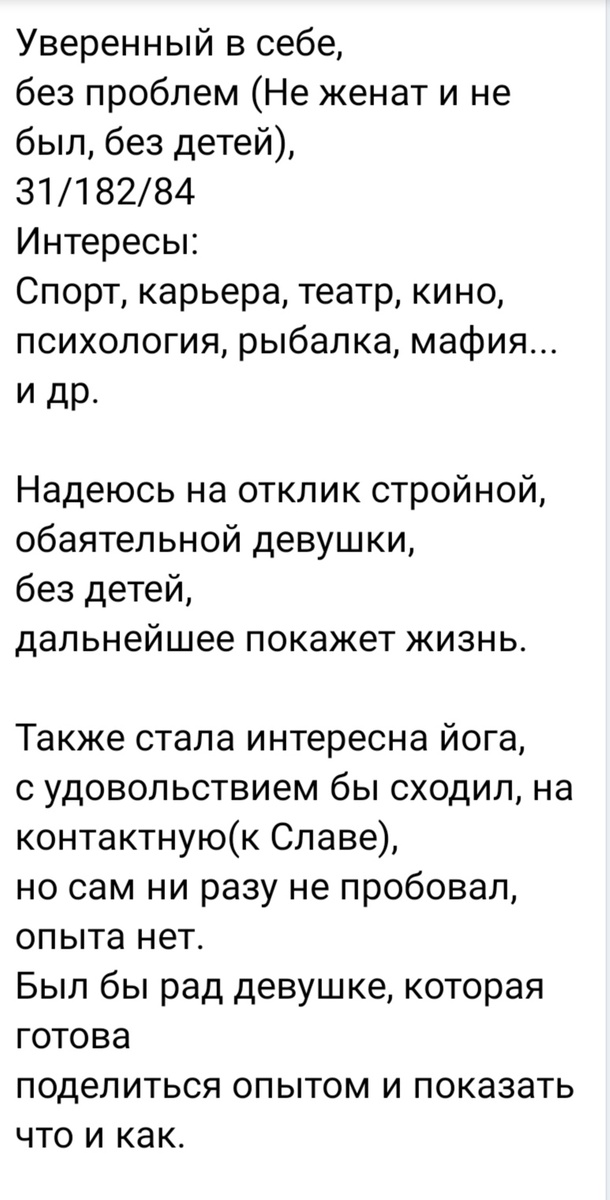 Продолжаю разбирать в тг-канале мужские и женские описания себя в профиле для знакомств (сайты, Тиндер итд). Сегодня разберу вот это описание мужчины. Расскажу, почему так не надо писать и кого можно привлечь на такое описание. Расскажу девушкам, какие мужчины пишут такое и что от них ждать.