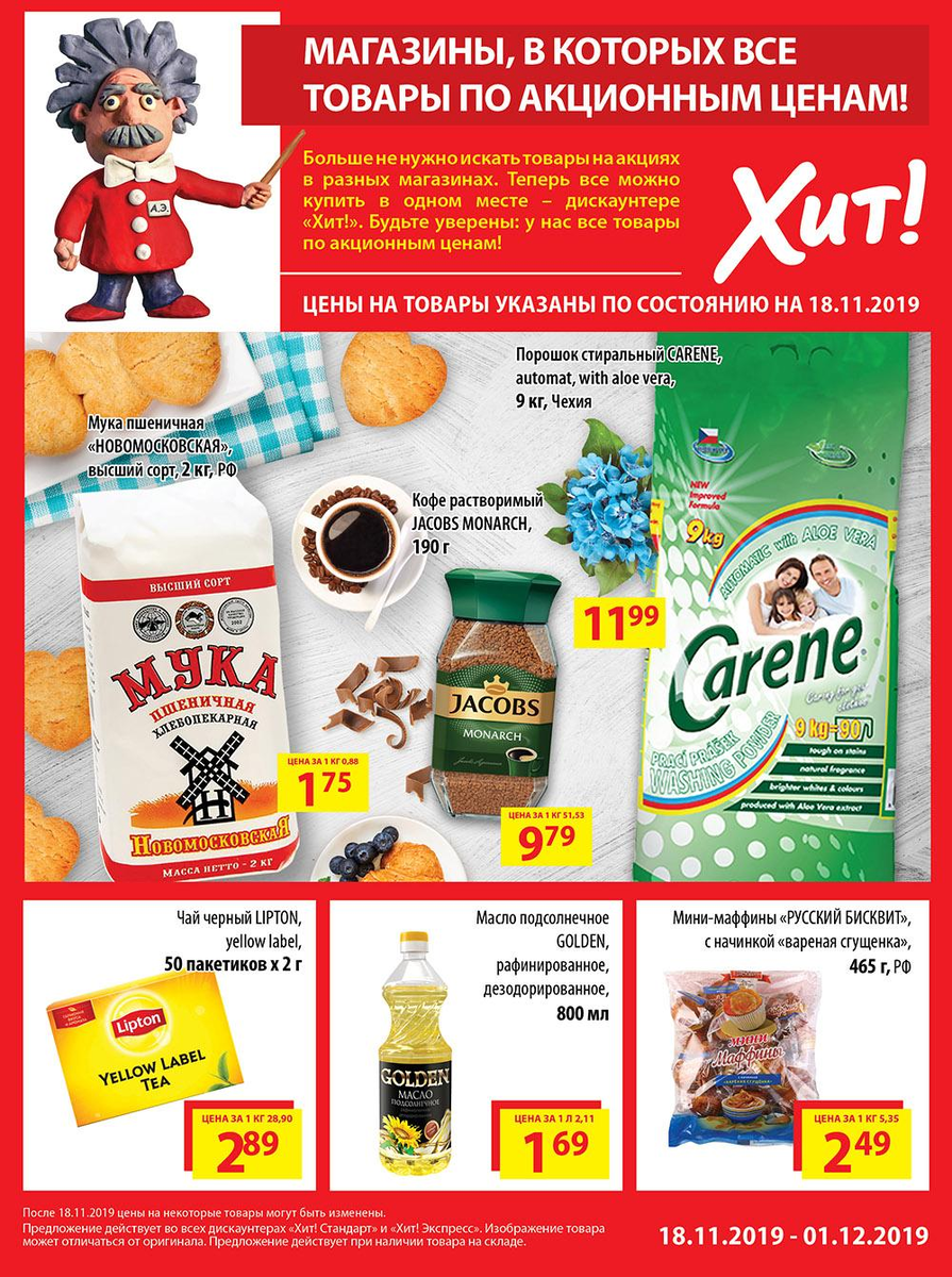 Скидки и акции только в дискаунтерах "Хит! Стандарт" с 21 октября 2019 г. Молоко "ЛЕГКАЯ ЦЕНА", 1,5%, 900 мл, РБ Колбаса вареная "ПРИМА", высший сорт, 1 кг, Минский м/к Сардельки "ТЕЛЯЧЬИ", высший сорт, 1 кг, Минский м/к Икра лососевая "ЧИНГАЙ", зернистая, 100 г, РБ Форель "РЫБАХИТ", филе-кусок, соленая, 200 г, РБ Рыба свежемороженая "МИНТАЙ", б/г, 1 кг Сметана "ЛЕГКАЯ ЦЕНА", 20%, 400 г, РБ Продукт плавленый с сыром "ПЛАВИНО", 45%, 400 г, РФ Колбаса варено-копченая "СЕРВЕЛАТ БАРБАДОС НОВЫЙ", высший сорт, 1 кг, Гродненский м/к Колбаса полукопченная "КУПЕЧЕСКАЯ НОВАЯ", высший сорт, 1 кг, Слонимский м/к Колбаса сырокопченая "ОРИГИНАЛЬНАЯ ЗАСТОЛЬНАЯ", 1 кг, Гродненский м/к Фарш свиной "НОВЫЙ", п/ф, 1 кг Тепловентилятор ENGY EN-513 Хурма, 1 кг Сыр "ПАРМЕЗАН ГРАНД", 45%, 200 г, РБ Голень варено-копченая "МЯСОГРАДСКАЯ", высший сорт, в/у, 430 г, Белмит Филе цыпленка-бройлера, п/ф, 1 кг Палочки рыбные VICI, п/ф, замороженные, 1 кг Кефир "СТАРЫ МЕНСК", 2,5%, 950 г, РБ Сыр "СУЛУГУНИ", 40%, 1