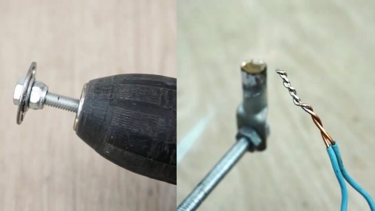 Зажимаем свободный конец стержня болта в патроне дрели и можно считать, что наше устройство для скрутки проводов готово к работе.