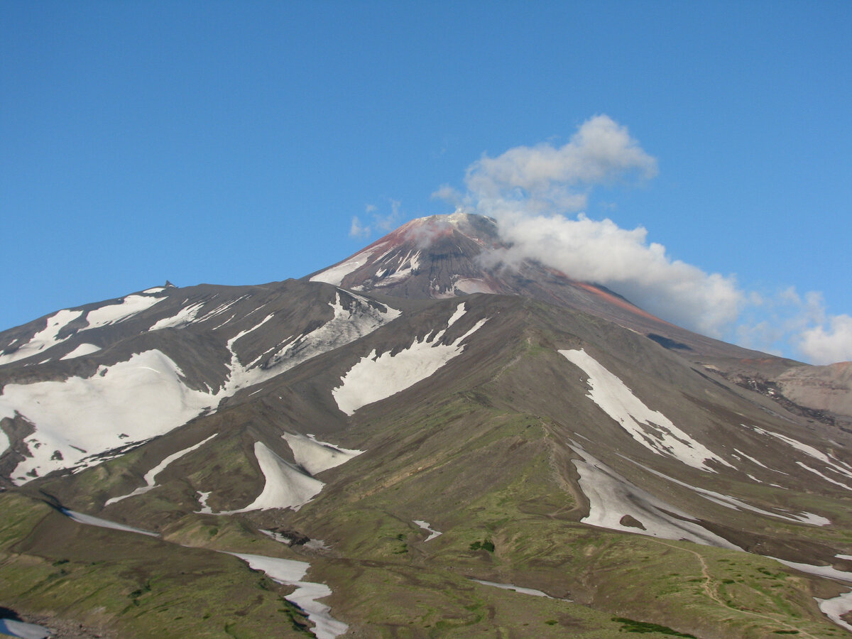 Одно из чудес Камчатки – вулканы. Они произвели на меня очень сильное впечатление, даже гейзеры затмили. Поэтому советую, если запланируете посещение Долины гейзеров, пусть оно будет сначала, а вулканы – после. «Первым делом на вулканы, ну а гейзеры - потом» в нашем случае не зашло. Хотя сама по себе экскурсия в Долину гейзеров и кальдеру Узона очень крутая (но об этом позже). Камчатка, видимо, готовилась к нашему приезду и решила показаться во всём своём многообразии, поэтому, когда мы приехали в Петропавловск, нас встретили ливень, лужи и грязь, сменившиеся на следующий день жуткой мелкой моросью, туманищем и холодрыгой. Так что никаких вулканов, будучи в городе, мы не увидели. А почему? Да просто они хотели более близкого знакомства. К моменту начала нашего активного тура распогодилось и вулканы предстали во всей своей красе и монументальности, тем сильнее поразив! Первый вулкан, который мы увидели – Вилючинский или Вилючик, как называют его местные жители (первый в карусели).