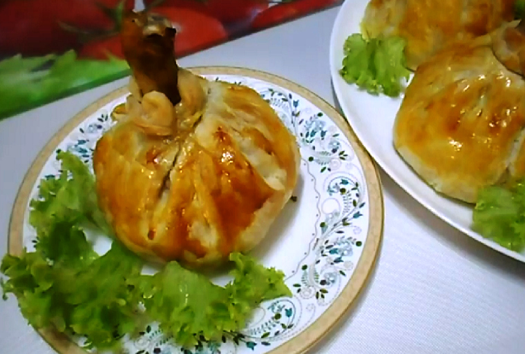 Красивое и вкусное горячее блюдо - куриные голени с картошкой в мешочках из бездрожжевого слоеного теста