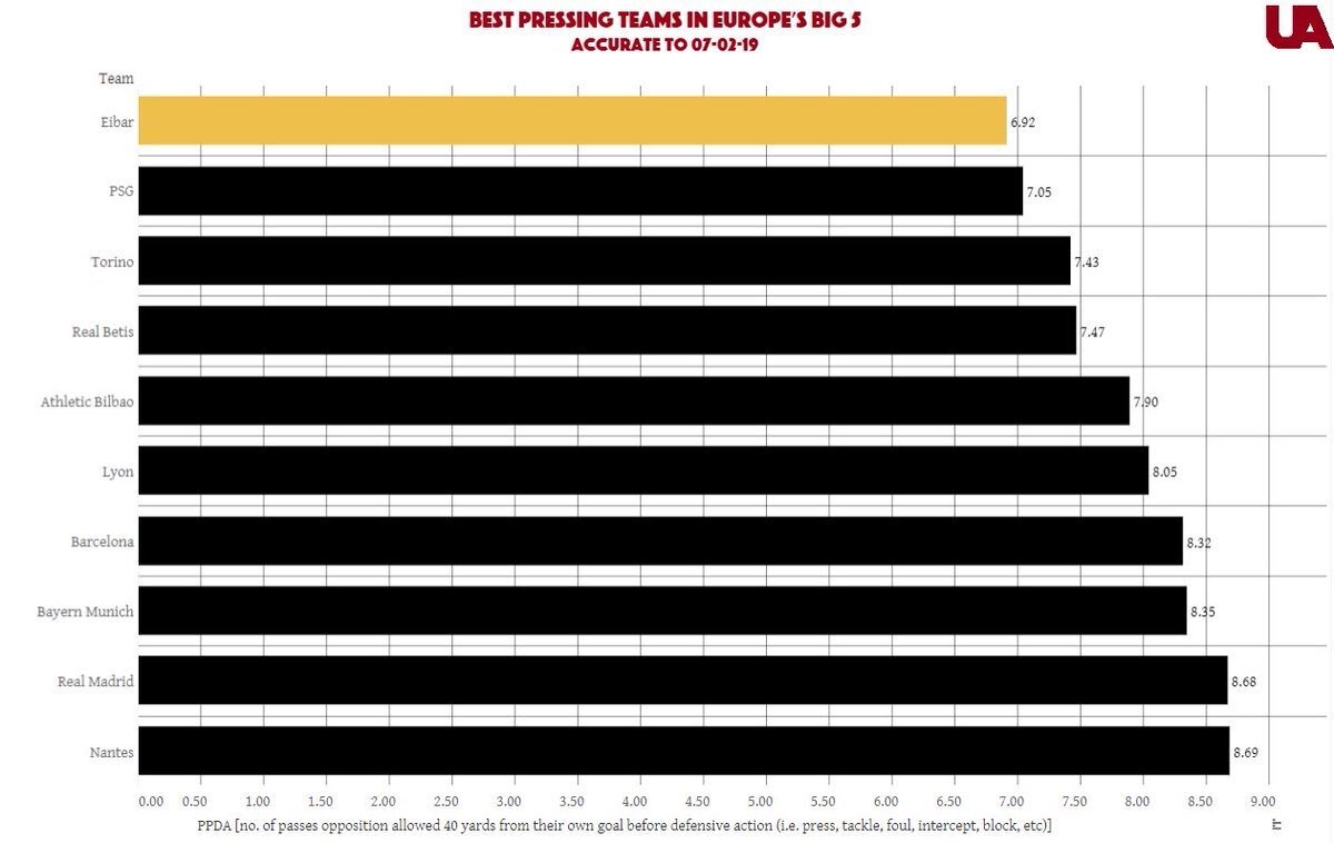 PPDA - метрика, оценивающая интенсивность прессинга. Считается как точные передачи соперника делить на число оборонительных действий (отборы, перехваты, попытки отборов, фолы) и все это на атакующих 3/5 поля. Начну с того, на что каждый болельщик АПЛ сразу же обратит внимание: В этом топе 5 клубов Ла Лиги, 3 клуба Лиги1, 1 клуб из Серии А и 1 клуб из Бундеслиги. 0 клубов АПЛ… Понятно, что такие клубы, как «ПСЖ», «Барселона», «Бавария», «Реал» в этом списке частные гости, но есть «Эйбар», «Торино» (9,70 в прошлом сезоне), «Бетис»… Но нет клубов АПЛ. На это, безусловно, влияет множество факторов. Средний показатель по Ла Лиге, например, 9,73. А вот в АПЛ он равен 11,89. В остальных лигах также всё лучше: Лига1 (10,71), Серия А (11,23), Бундеслига (11,75). Но АПЛ уж точно не разделяет пропасть от остальных лиг. «МанСити», например, со своими 8,78 не так уж далеки от 10-го «Нанта» (8,69), а в прошлом сезоне у «горожан» были совсем уж недостижимые даже для «Эйбара» цифры в 6,40 Свежий ре