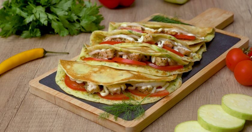 При правильном хранении сочные кабачки будут радовать вас всю зиму, поэтому стоит запастись дельными рецептами с участием этого универсального овоща. Предлагаем пополнить вашу коллекцию аппетитными кабачковыми кармашками с начинкой. Последнюю предлагаем сделать из запеченной курочки, маринованного лука и помидоров, но тут вы можете пофантазировать: положить в середину румяного блина свежие огурцы с консервированным тунцом или обжаренную телятину с хрустящими листьями салата. Мягкое тесто на кефире легко превращается в золотистые блинчики, которые несложно будет сложить вдвое на манер мексиканского тако. Так что смело беритесь за приготовление этих чудесных кармашков! Ингредиенты Кабачок300 г Сахар1,5 ч. л. Кефир200 мл Яйцо3 шт. Пшеничная мука140 г Разрыхлитель0,5 ст. л. Чеснок2 зуб. Укроп0,5 пуч. Подсолнечное масло2 ст. л. Сливочное масло20 г Помидор2 шт. Лук1 шт. Куриное филе250