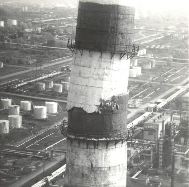 9 сентября 1991 года на нефтеперерабатывающем заводе в Уфе произошло разрушение конструкции бетонной 150-метровой дымовой трубы. В результате 30-метровая часть трубы весом 700 тонн зависла на высоте 120 метров. А внизу - огромные емкости с бензолом, фенолом и другими ядовитыми веществами. Кроме того, там - переплетения различных трубопроводов, газгольдерные батареи. В случае падения этот примерно 700-тонный кусок, по расчетам специалистов, может вызвать 9-балльное землетрясение в радиусе нескольких сот метров, серию взрывов, пожаров, выброс опасных веществ, и создать угрозу не только персоналу объекта, но и населению города. Это мог быть своего рода второй Чернобыль. В этих условиях принимается научно обоснованное, но рискованное решение не просто обрушить нависшую часть трубы, а "срезать" её взрывом, довернув в воздухе на нужный угол, и уронить на заранее подготовленную площадку размером 20 на 20 метров с подушкой из песка и брёвен для смягчения удара. Рискуя жизнью, спасатели ГКЧС о