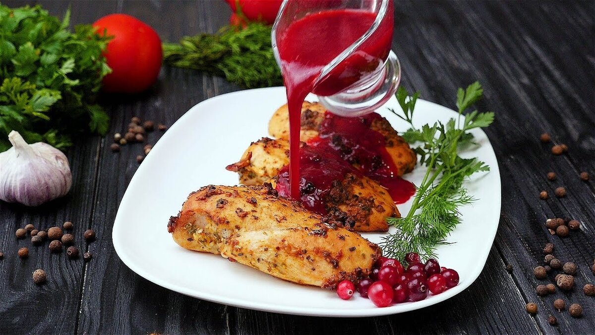 Пошаговый рецепт вкусного и красивого ужина. Ингредиенты: 1 кг куриных грудок 0,5 л бульона 3 ст.л. сливочного масла 1 ч. л. тимьяна 250 гр. клюквы 50 гр. сахара соль перец Приготовление: 1. Смешать размягченное сливочное масло, соль и тимьян. 2. Куриные грудки разделить на порционные куски или пласты. Вымыть и обсушить полотенцем. 3. Обмазать масляной смесью куриные грудки и выложить в форму для запекания. 4. Разогреть духовку до 180 градусов. 5. Выпекать курицу в течение 20 минут. 6. В сотейник или в сковороду влить бульон, добавить ягоды клюквы и всыпать сахар. Можно взбить смесь блендером. 7. Тушить соус до испарения жидкости. Должна получиться достаточно густая масса желеобразной консистенции. 8. Солить и перчить соус-заправку только перед снятием с огня. 9. Выложить куриную грудку в порционные тарелки. Сверху полить клюквенным соусом. Блюдо отлично сочетается с гарниром из картофеля, круп или макаронами. Приятного аппетита! Кулинарные советы: курица с клюквенным соусом очень