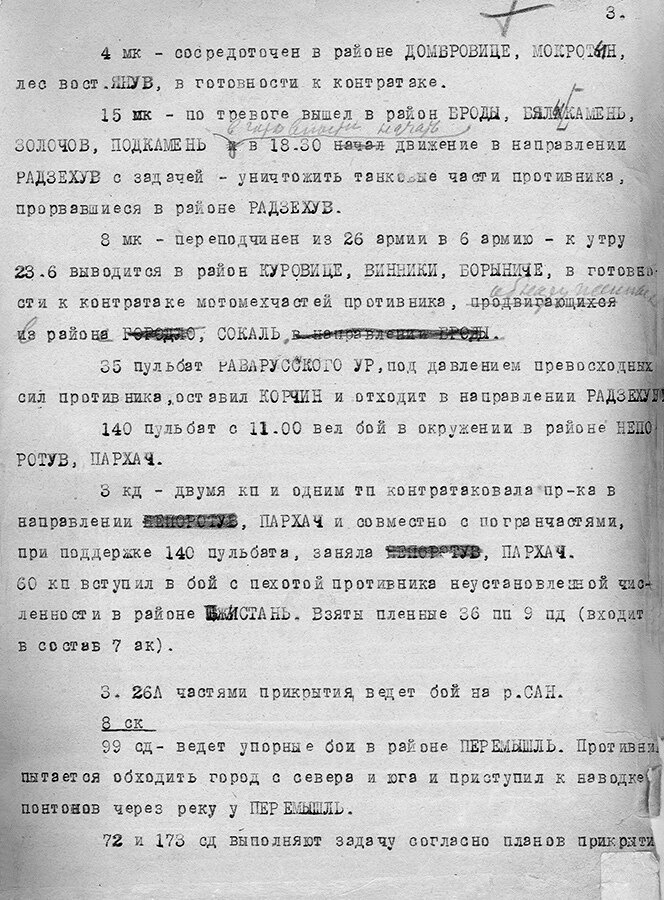 27 ск ведет бой на фронте (иск.) Порыцк, Стоянув; в 16.30 до 500 танков противника прорвались на Горохув и ведут наступление на Броды; для уничтожения прорвавшихся танков противника направлены 22 мк из Луцка и 9 мк из Ровно.