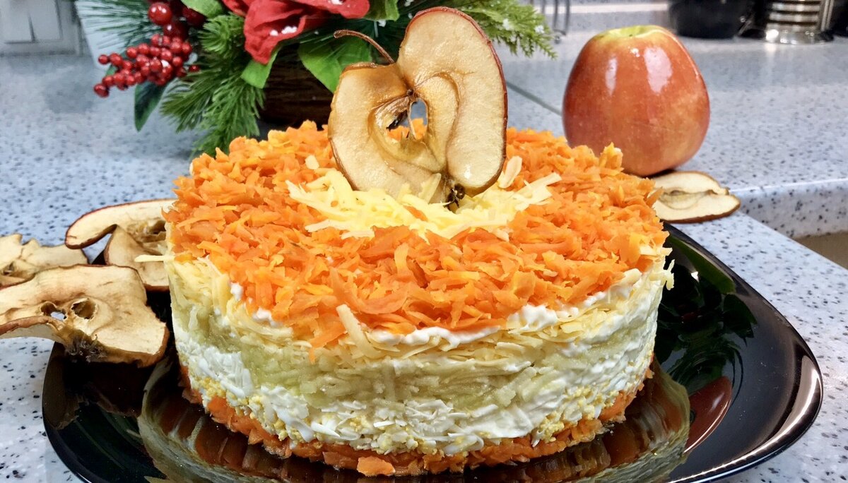 5. 150 г твердого сыра тру на крупной терке, выкладываю следующим слоем и покрываю майонезом только по краям. 6. По краям выкладываю морковку и отправляю в холодильник на несколько часов, чтоб салат пропитался.