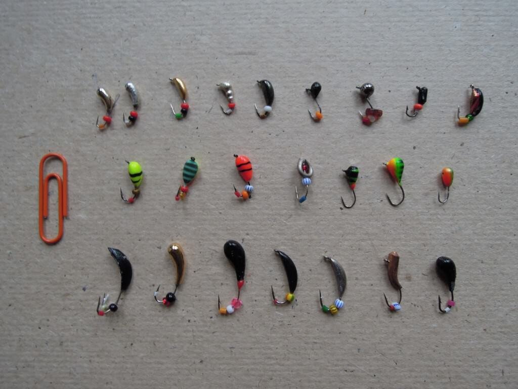 Окуня в декабре ловят как на мормышки с насадкой, так и на безмотылку. Для ловли на мормышку с мотылём популярными моделями являются «дробинка», «капля», «уральская», «гвоздик», «нимфа». Для ловли на «безмотылку» чаще всего применяют классического «чёртика», «козу» «ведьму». Предпочтение стоит отдать вольфрамовым мормышкам, так как при одинаковом весе они меньше по размеру чем свинцовые. Цвета мормышек для ловли окуня обычно используются светлые, серебристые, чёрные и золотистые мормышки. Масса и размер мормышки подбираются под условия ловли. Для ловли на небольшой глубине в стоячем водоёме достаточно мормышки весом в 0,2-0,3 грамма. Чем больше глубина, сильнее течение и тоще леска, тем тяжелее должна быть мормышка. В качестве наживки на мормышку насаживают одного-двух, реже больше мотылей. При ловле на безмотылку на крючки мормышки часто нанизывают цветные бисеринки и кембрики.