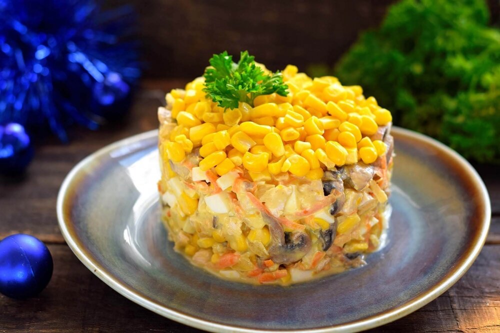 Салат имеет отменный ингредиентный состав, продукты отменно дополняют друг друга. Салат получается очень сытным и питательным, его можно смело подавать на стол, как самостоятельное блюдо, без гарниров и мясных ингредиентов. Такой салат украсит любой торжественный стол, он очень яркий и аппетитный. · Филе индейки (курицы) – 200 г. · Шампиньоны – 300 г. · Кукуруза консервированная – 100 г. · Морковь – 1 шт. · Лук – 1 шт. · Яйца – 2 шт. · Майонез – 3 ст.л. · Растительное масло – 2 ст.л. · Соль, перец – по вкусу · Зелень – для подачи С головки лука снимите шелуху, овощ ополосните, нарежьте кубиками или перьями, закиньте на раскаленную масляную сковороду. Лук жарьте отдельно следующие 3 минуты. Морковь очистите, натрите на крупной терке, добавьте к луку. Овощи пассеруйте совместно несколько минут, они должны напитаться маслом, стать мягче, при этом не зажарится. После жарки морковно-луковую смесь отожмите от масла, переложите в тарелку, остудите. Шампиньоны вымойте, нарежьте крупными ломтик